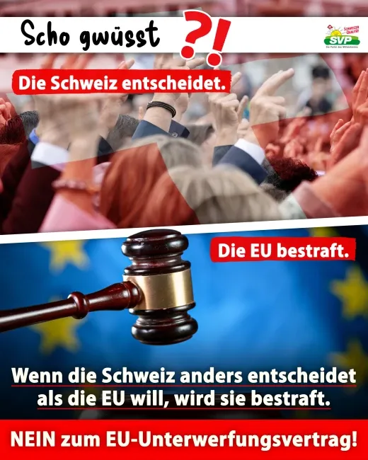Wenn die Schweizer Bevölkerung🇨🇭 in einer Volksabstimmung etwas beschliesst, das der EU🇪🇺 nicht passt, dann darf uns die EU mit Sanktionen bestrafen. Das sind Kolonial-Verhältnisse! Wer das nicht will, sagt Nein zum EU-Unterwerfungsvertrag.❌