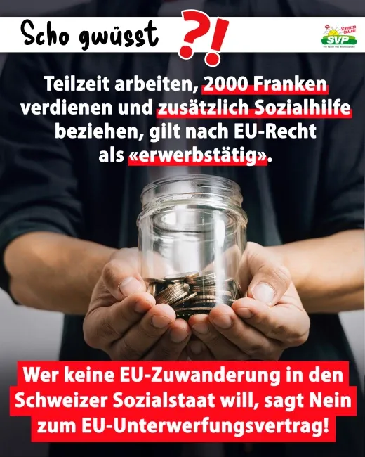 Mit dem EU-Unterwerfungsvertrag muss die Schweiz allen EU-Zuwanderern neu nach 5 Jahren das Recht auf dauerhaften Aufenthalt geben. Selbst wenn sie Sozialhilfe beziehen! Denn nach EU-Recht gelten Zuwanderer, die Teilzeit arbeiten, 2000 Franken verdienen und zusätzlich Sozialhilfe beziehen als «erwerbstätig» und dürfen hierbleiben! Die Kosten dafür muss einmal mehr der Schweizer Steuerzahler tragen. Wer nicht noch mehr EU-Zuwanderung in unseren Sozialstaat will, sagt NEIN zum EU-Unterwerfungsvertrag.❌