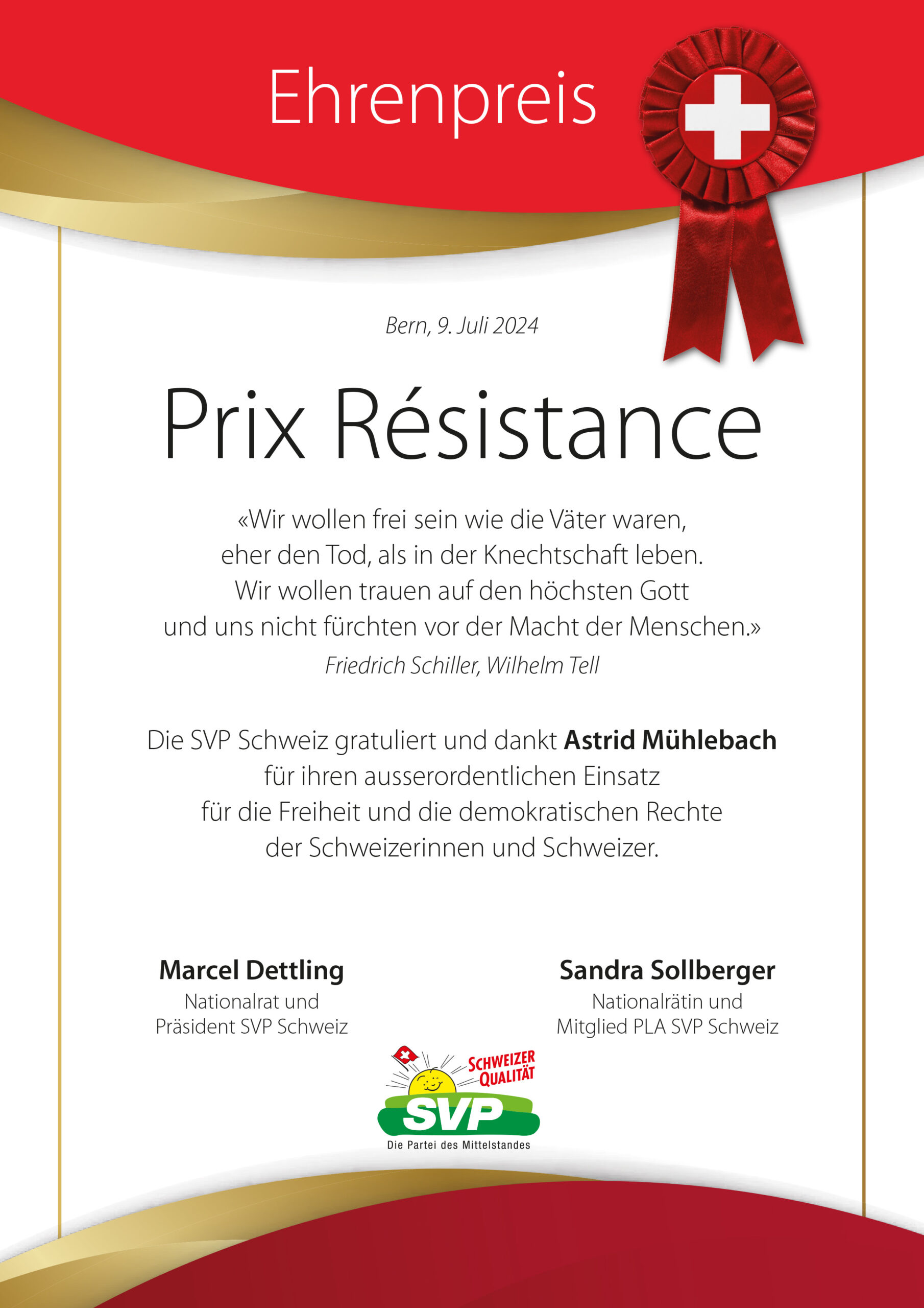«Der mutige Einsatz von Astrid Mühlebach verdient Respekt und Anerkennung», sagt SVP-Präsident und Nationalrat (SZ) Marcel Dettling bei der Übergabe des Prix Résistance. «Für solche engagierten Schweizerinnen und Schweizer, die unsere Heimat verteidigen, haben wir den Prix Résistance geschaffen.»