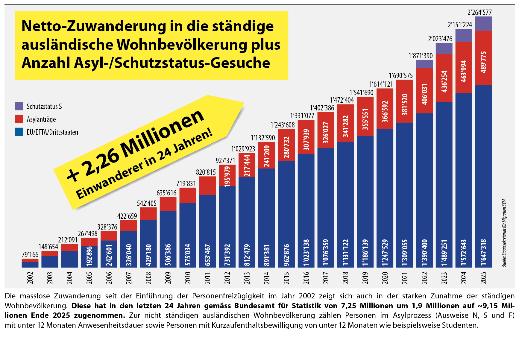 Die Schweiz hat Ende 2025 rund 9,1 Millionen Einwohnerinnen und Einwohner. Die ständige Wohnbevölkerung hat innerhalb von 12 Jahren um 1 Million Menschen zugenommen. Diese masslose Zuwanderung muss gebremst werden.