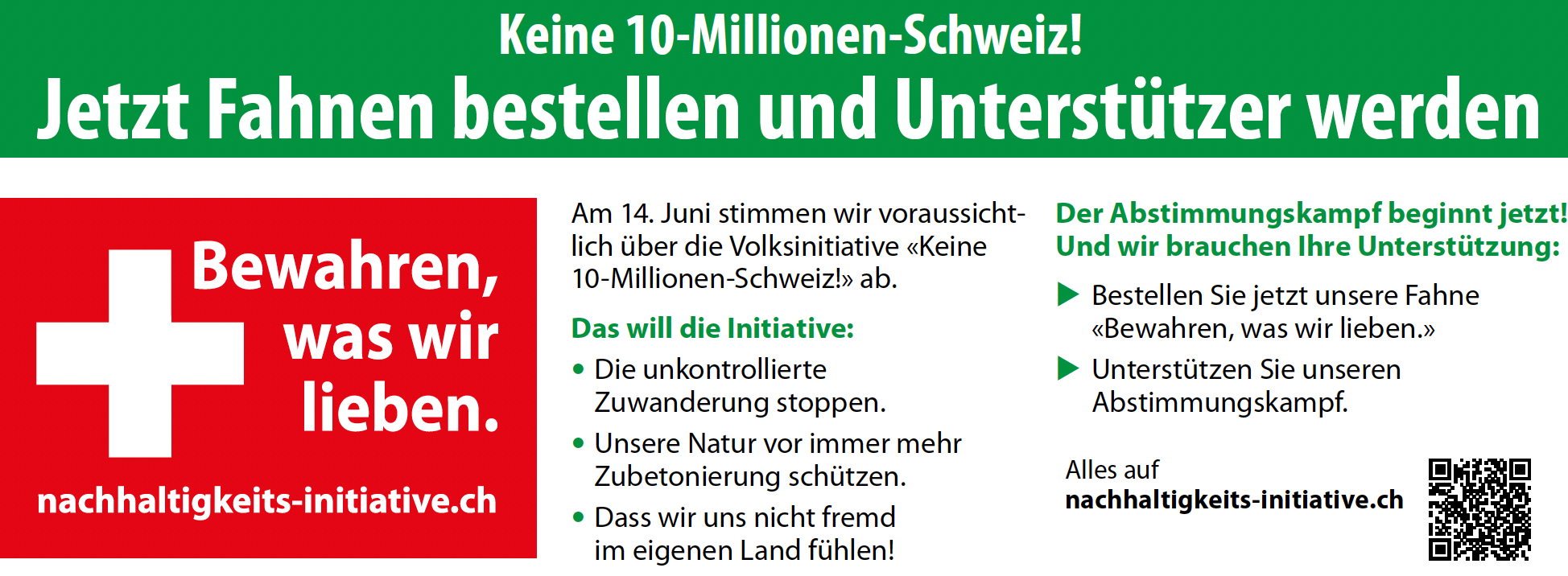 Wer eine vernünftige Zuwanderung will, stimmt für die Nachhaltigkeits-Initiative «Keine 10-Millionen-Schweiz!».