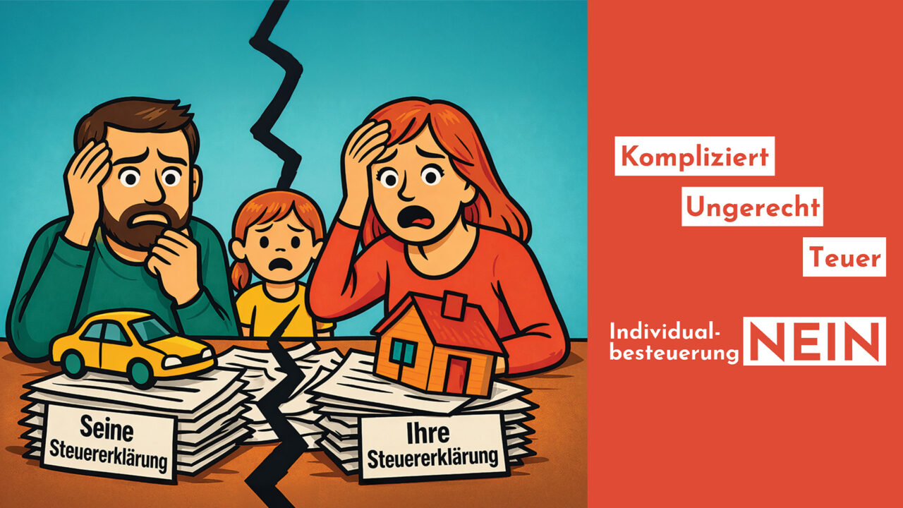 Eine breite überparteiliche Allianz lehnt die Einführung der Individualbesteuerung entschieden ab. Die Reform, die als Lösung gegen die sogenannte Heiratsstrafe präsentiert wird, würde in Wirklichkeit neue Ungerechtigkeiten schaffen, die Steuer-Bürokratie massiv ausbauen und hohe Kosten für Bund, Kantone, Gemeinden und Steuerzahlende verursachen.