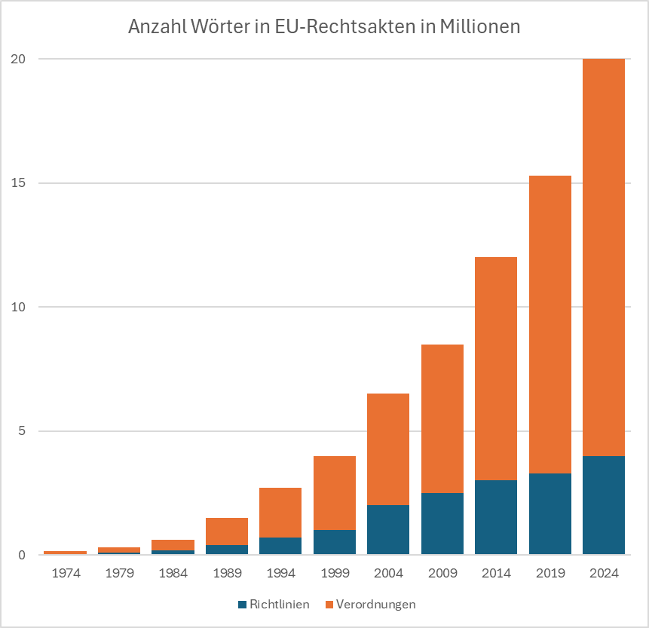 Seit Inkrafttreten des Vertrages von Lissabon (2010) hat sich das Volumen der EU-Gesetzgebung auf knapp 20 Millionen Wörter verdoppelt. Bestand ein durchschnittlicher EU-Rechtsakt im Jahr 2000 noch aus rund 54’000 Wörtern, waren es 2024 knapp 160’000 Wörter. Vor allem die Zahl an direkt anwendbaren EU-Verordnungen nahm in dieser Zeit deutlich zu.[2]