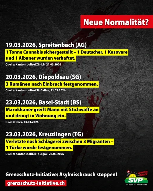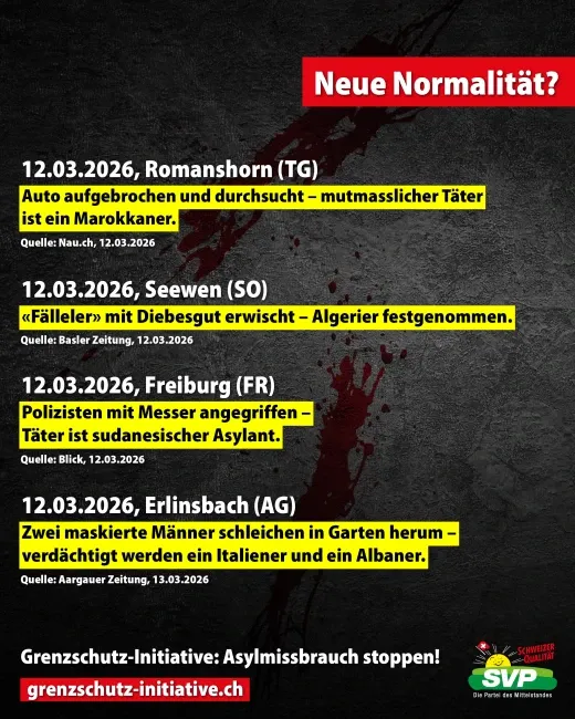 «Gewalt und Kriminalität in der Schweiz haben massiv zugenommen. Fast täglich kommt es zu Messerstechereien, Vergewaltigungen, Einbrüchen und Diebstählen. Die Täter sind oft Asyl-Migranten. Während Deutschland dank Grenzkontrollen tausende Illegale an der Grenze zur Schweiz abweist, lehnt Bundesrat Jans Grenzkontrollen nach wie vor ab. Wer in der Schweiz endlich Grenzkontrollen und ein Ende des Asyl-Chaos will, unterschreibt die Grenzschutz-Initiative! Jetzt unterschreiben https://grenzschutzinitiative.ch»