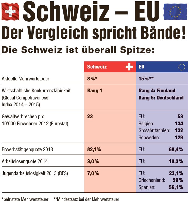 Tatsache ist aber, dass die Schweiz trotz ihrer vermeintlichen Nachteile einen wirtschaftlichen Spitzenplatz einnimmt, gar als wettbewerbsfähigste Nation der Welt bezeichnet wird. Trotz hoher Löhne und starkem Franken, dank tiefer Verschuldung, Budgetdisziplin, moderaten Steuern und freiheitlichem Arbeits- und Wirtschaftsrecht. Zu verdanken haben wir dies unserer gut gebildeten und fleissigen Bevölkerung und auf staatlicher Systemebene unserer direkten Demokratie. Mit den umfassenden Mitspracherechten des Volkes und der Stände in Verfassungs- und Gesetzgebungsfragen gewährleistet sie diese staatliche Qualität samt Rechtssicherheit.
