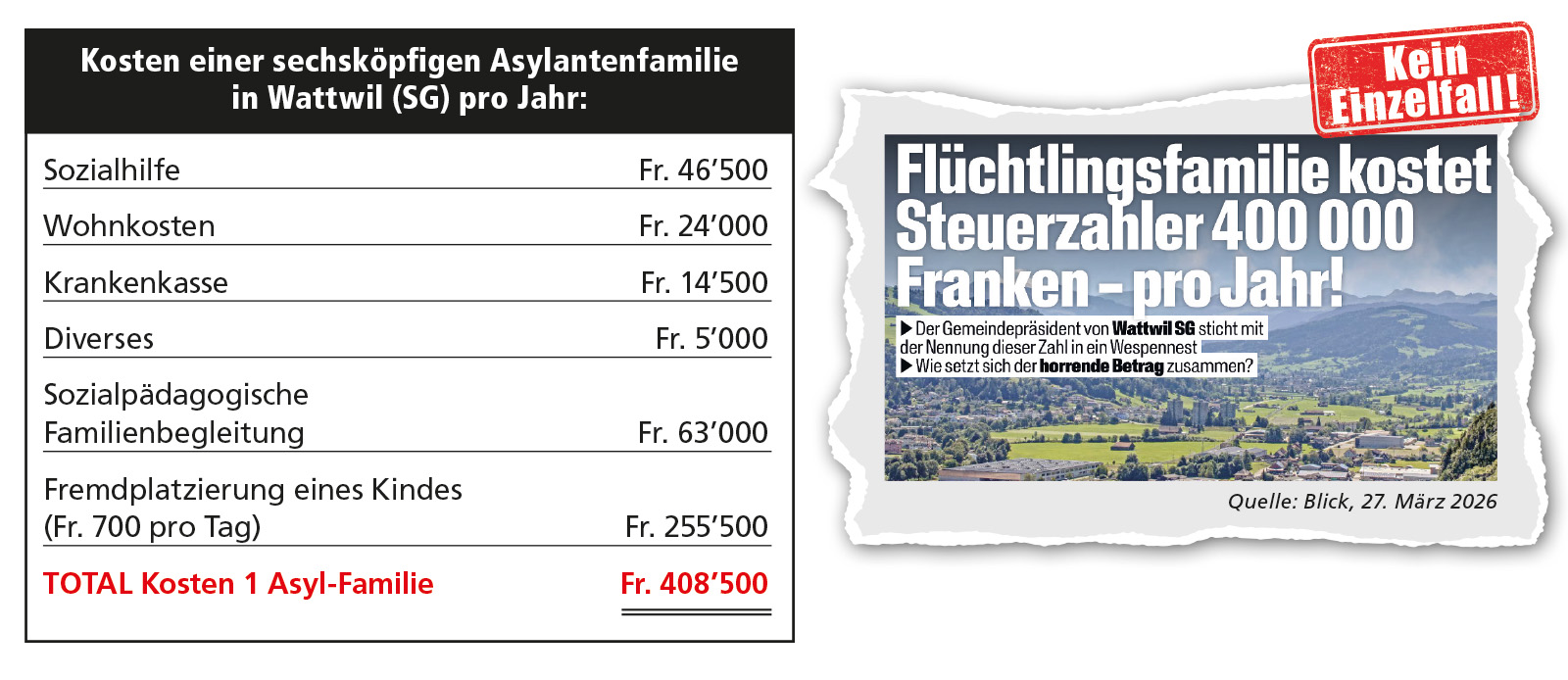 Massnahmen, die in der Regel die Kindes- und Erwachsenenschutzbehörde (Kesb) anordnet – damit erfahren die Bürger von Wattwil (SG) nicht, was sie alles noch zusätzlich bezahlen. Mit der Nachhaltigkeits-Initiative «Keine 10-Millionen-Schweiz!» setzen wir am 14. Juni ein Zeichen gegen diesen Asyl-Irrsinn!