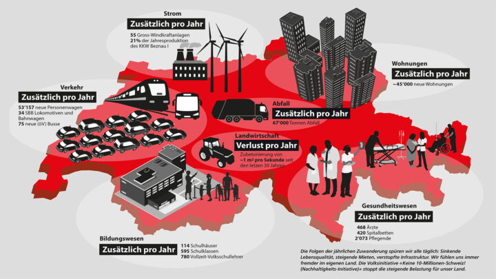 Unsere schöne Landschaft wird zubetoniert. Die Züge sind verstopft. Man steht stundenlang im Stau. Wir spüren alle, wie sich die Lebensqualität in der Schweiz verschlechtert.