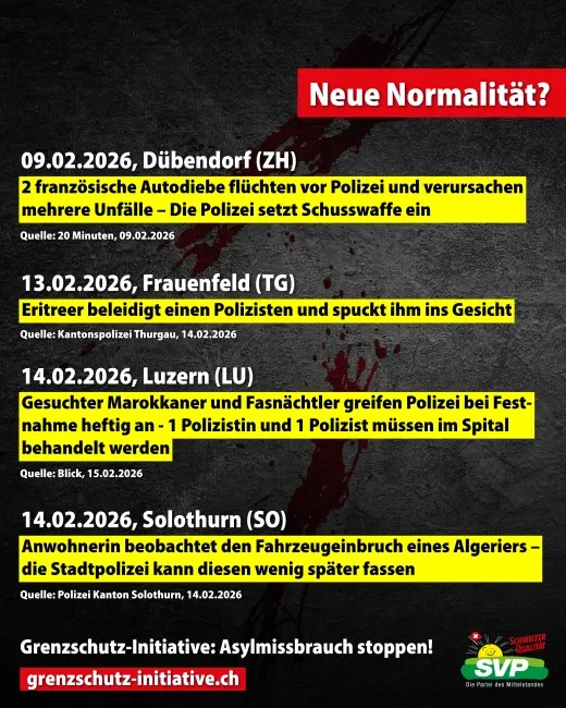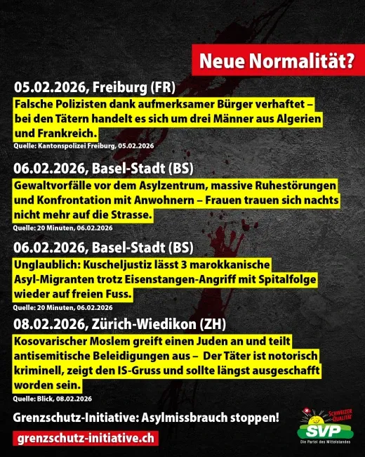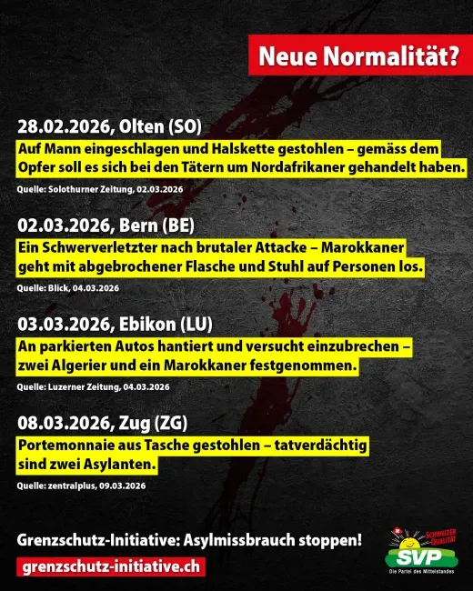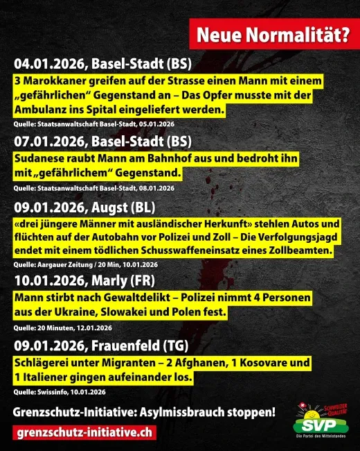 «Gewalt und Kriminalität in der Schweiz haben massiv zugenommen. Fast täglich kommt es zu Messerstechereien, Vergewaltigungen, Einbrüchen und Diebstählen. Die Täter sind oft Asyl-Migranten. Während Deutschland dank Grenzkontrollen tausende Illegale an der Grenze zur Schweiz abweist, lehnt Bundesrat Jans Grenzkontrollen nach wie vor ab. Wer in der Schweiz endlich Grenzkontrollen und ein Ende des Asyl-Chaos will, unterschreibt die Grenzschutz-Initiative! Jetzt unterschreiben https://grenzschutzinitiative.ch»