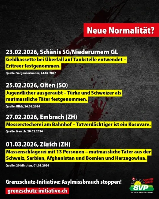 Raubüberfalle, Vergewaltigungen, Messerstechereien und Einbrüche sind an der Tagesordnung. Insbesondere kriminelle Asyl-Migranten verüben teils schwerste Gewalttaten. Das herrschende Asyl-Chaos gefährdet die innere Sicherheit der Schweiz und kostet die Steuerzahler Milliarden. Statt die Grenzen zu kontrollieren, verweigert der verantwortliche SP-Bundesrat Jans griffige Massnahmen zum Schutz der eigenen Bevölkerung. https://grenzschutzinitiative.ch/